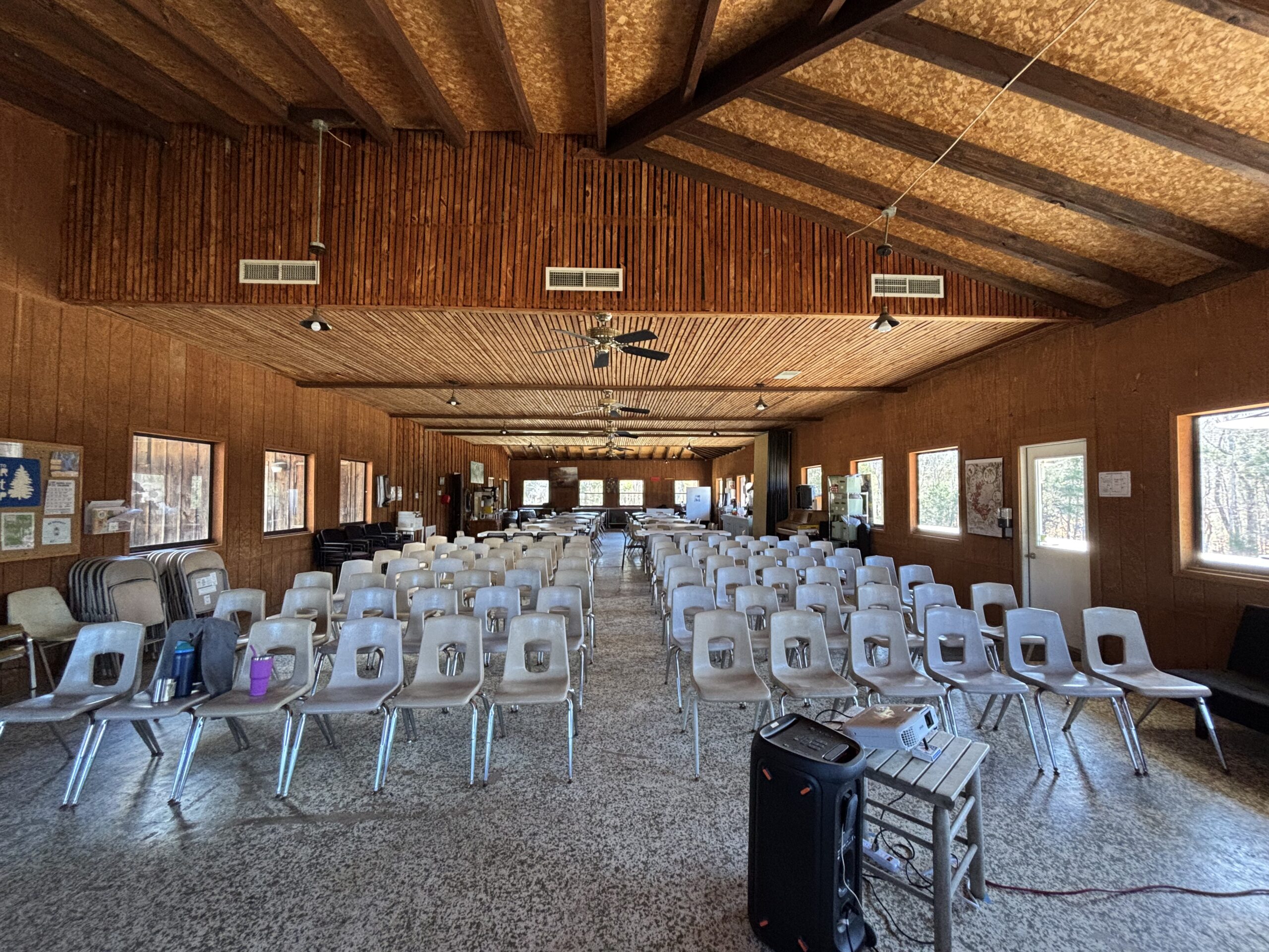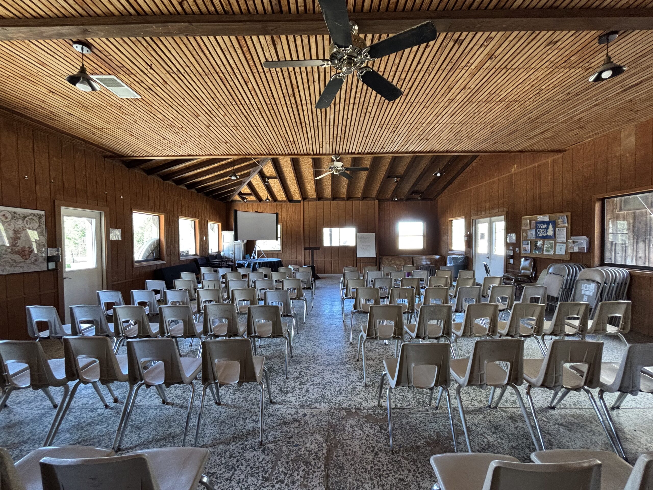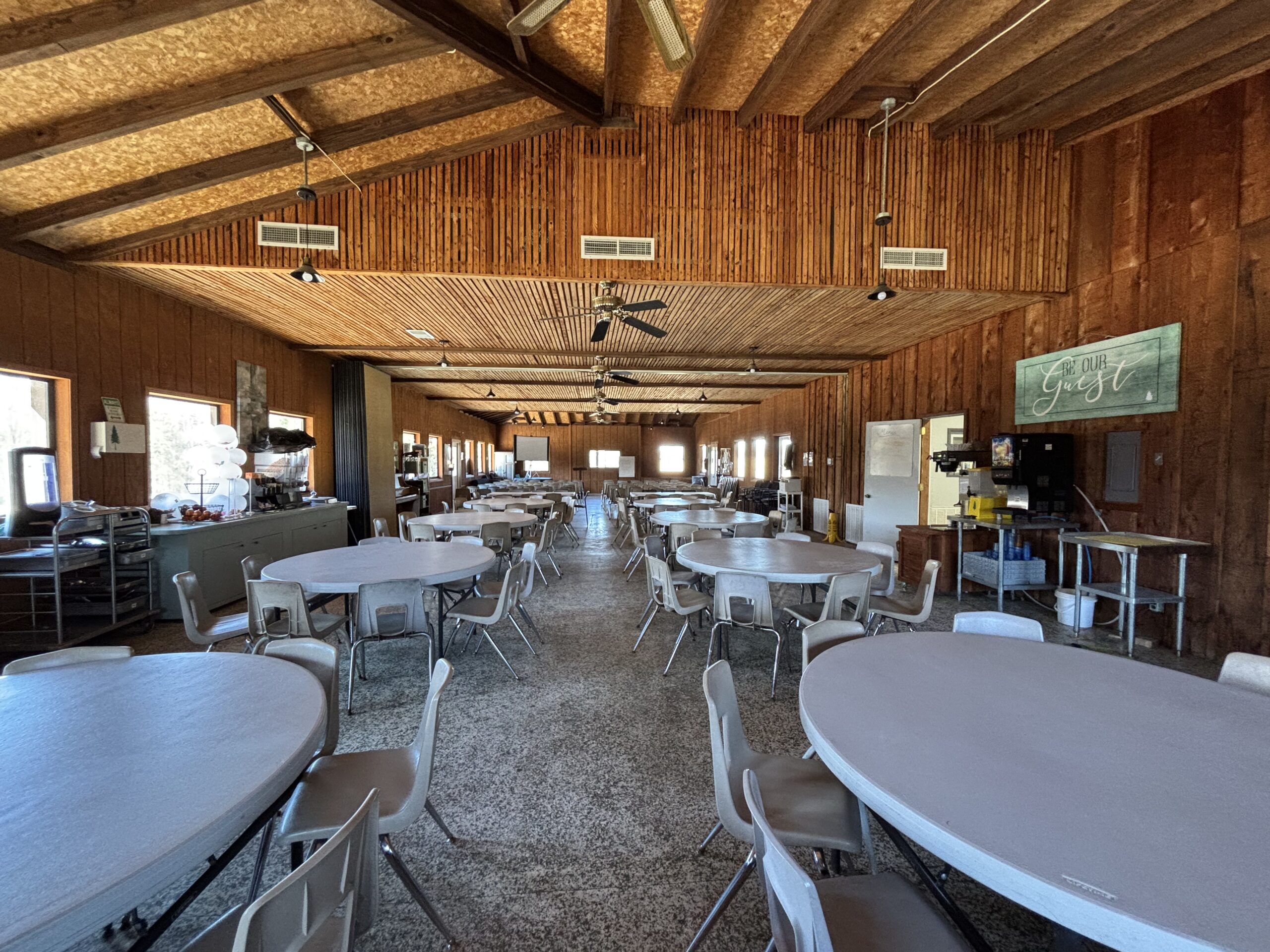 The Cedar Crest Dining Hall is located in our main camp area and has space for 150-200 people in chair-only layout and 75-125 in tables and chairs layout. We promote eating family-style here during our meal times, where each table shares each meal with one another. Learners can share in great meals with one another while also learning about our relationships with the food we eat throughout your stay.